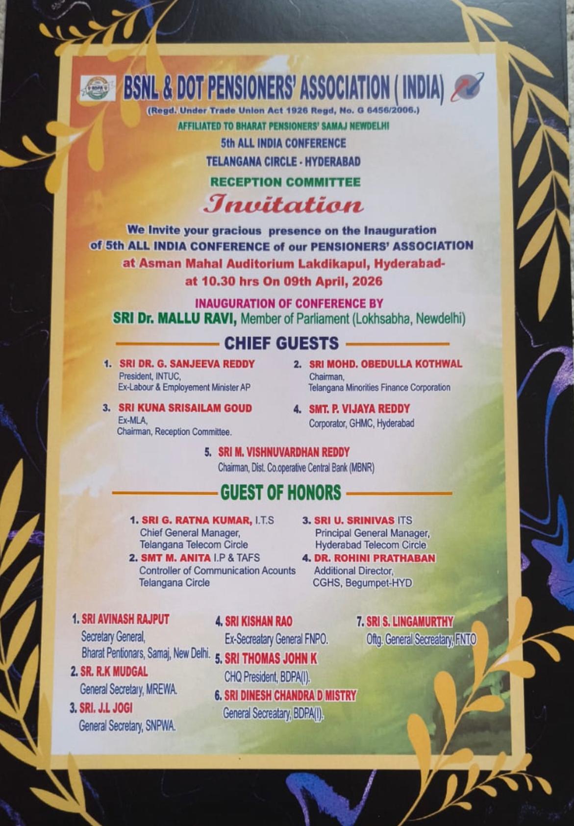 5th ALL INDIA CONFERENCE of BSNL & DOT PENSIONERS ASSOCIATION (INDIA) held on 8th & 9th April, 2026 in Hyderabad.