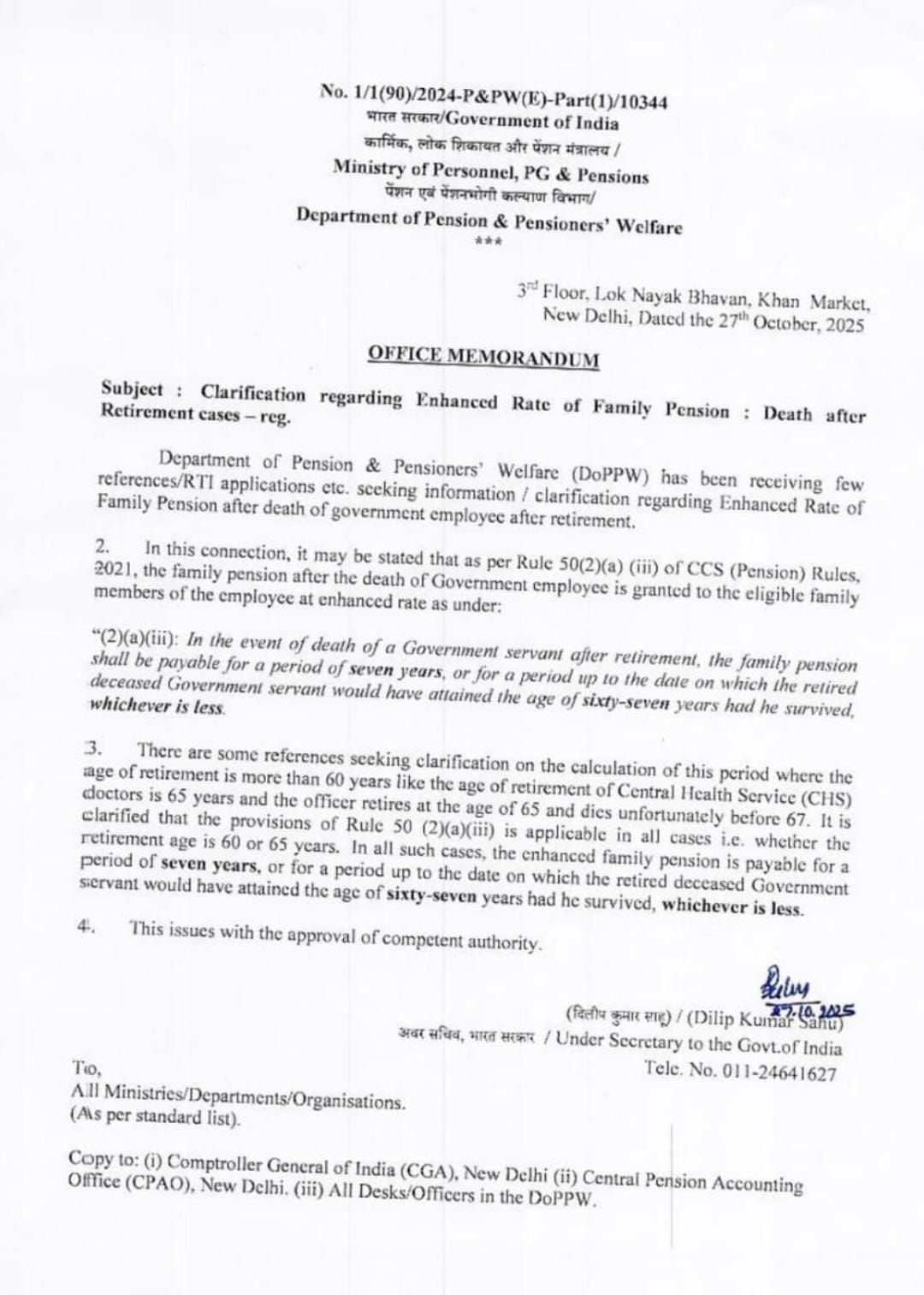 CLARIFICATION ISSUED BY DEPARTMENT OF PENSION & PENSIONERS WELFARE (DOP&PW) ON ENHANCED RATE OF FAMILY PENSION..